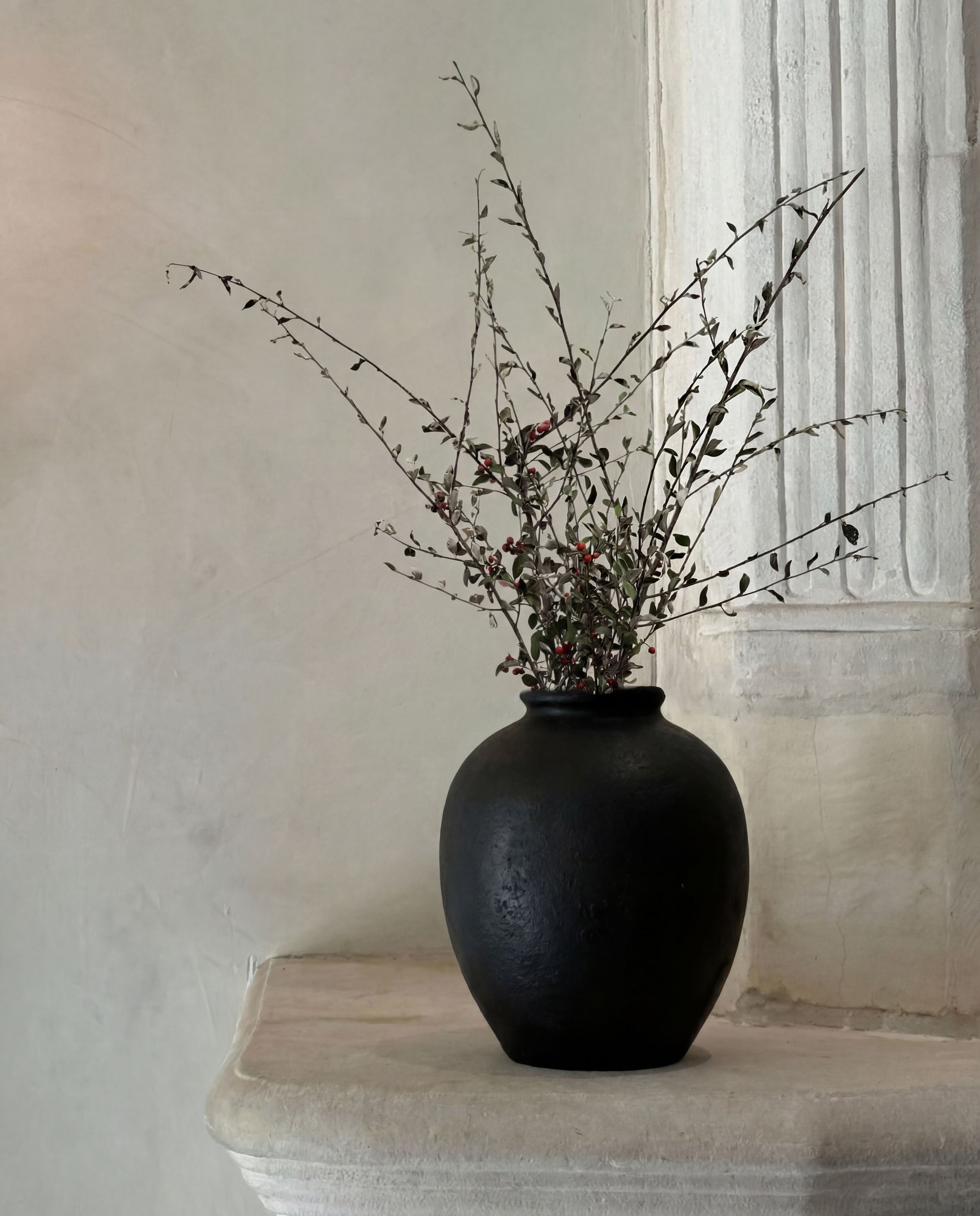 Ramas naturales con acentos rojos en un jarrón artesanal negro que aporta carácter y serenidad.