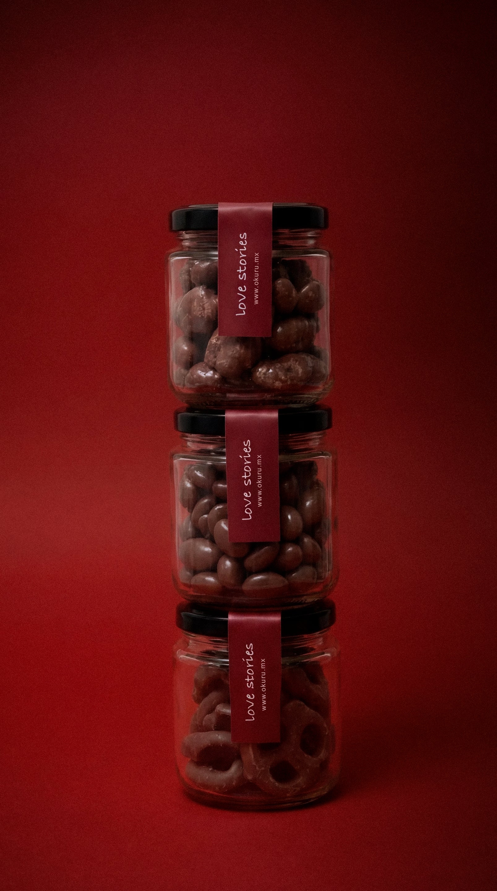 Un set de snacks cuidadosamente seleccionados que combina texturas y sabores equilibrados. Almendras, pasas y pretzels cubiertos de chocolate un detalle minimalista y delicioso, ideal para regalar o disfrutar en cualquier ocasión.