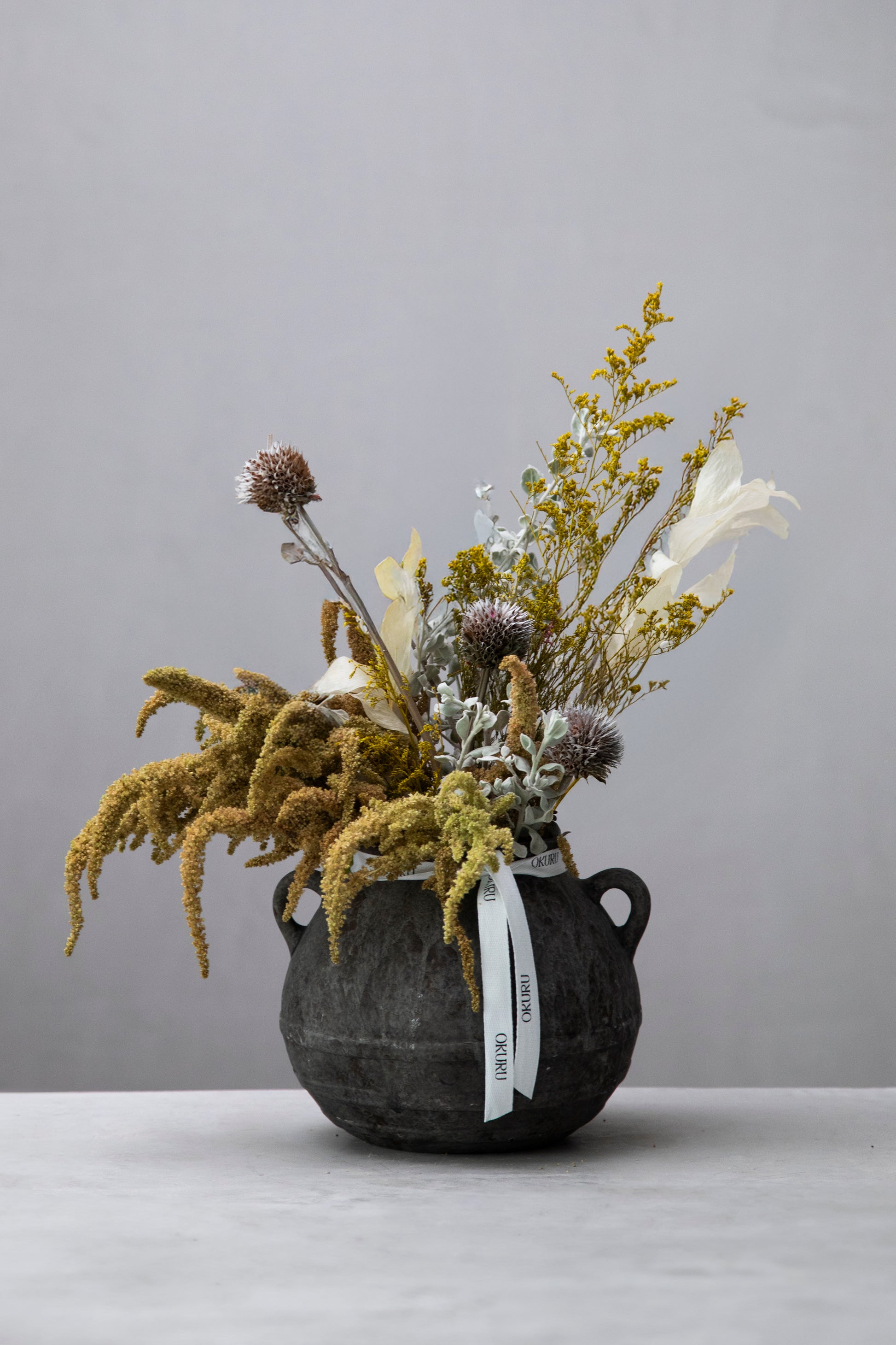 Arreglo de follaje seco en tonos neutros, con caída natural. Montado en un jarrón de barro gris, fabricado artesanalmente por Okuru. Una pieza contemporánea y única, perfecta para sorprender a alguien especial.