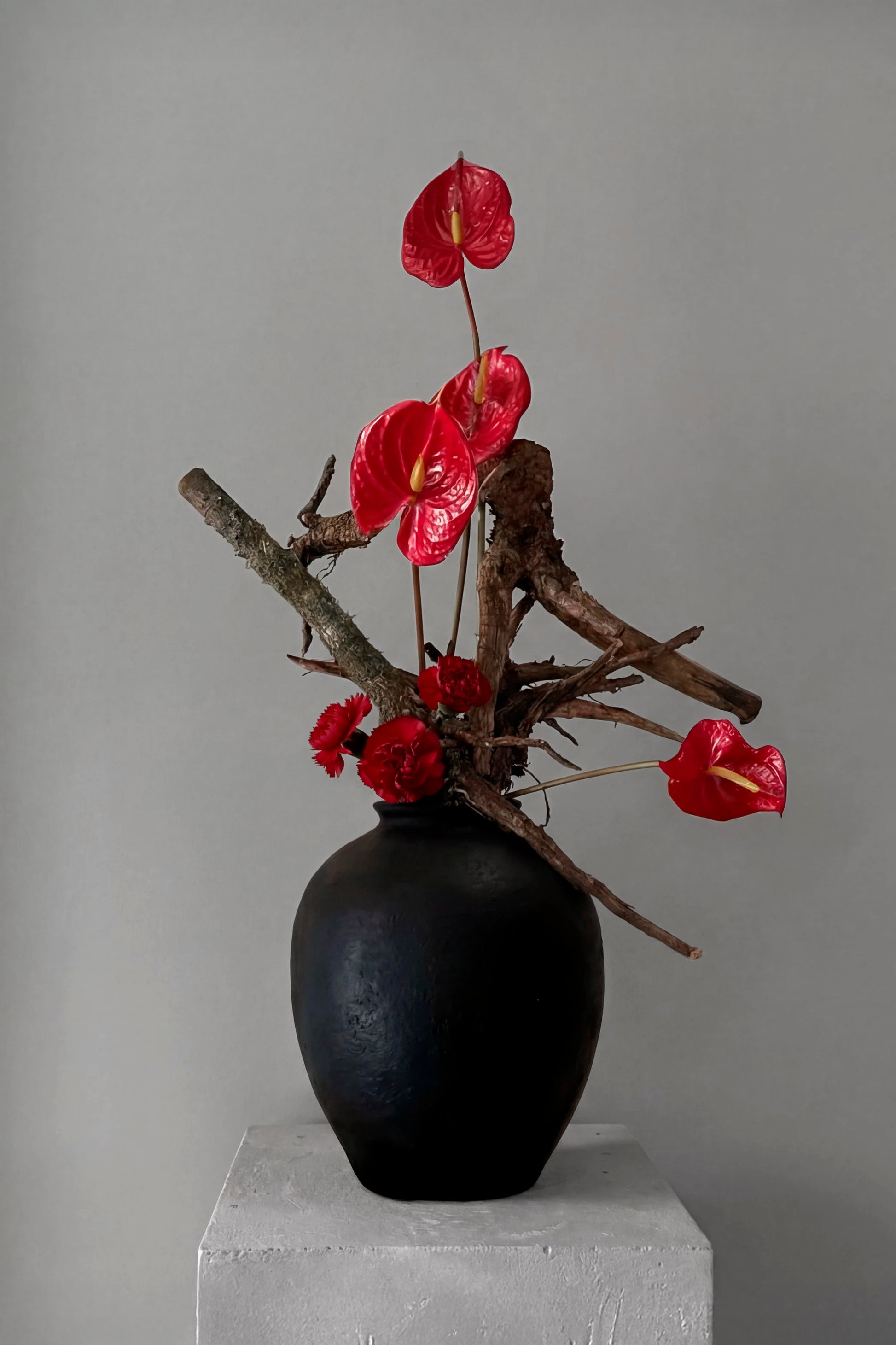 Una composición escultórica de líneas puras y contraste profundo. Elementos naturales enmarcados en un jarrón negro mate crean una pieza de carácter contemporáneo. El mejor regalo para San Valentín o para alguien verdaderamente especial.